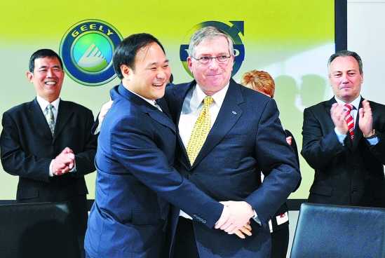 李书福(前左)与布思(前右)签约后握手。 新华社记者 武巍 摄