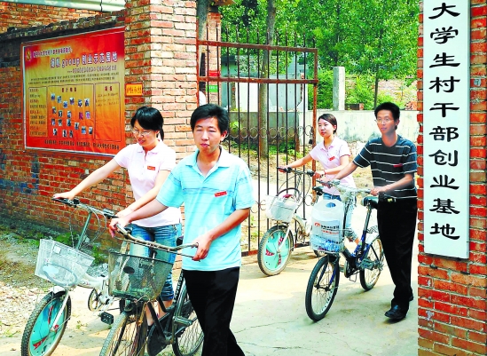 创业,正成为大学生村官了解农村,融入农村,带动农民致富的重要途径。图为4名大学生村官从创业基地中外出的场景。 新华社发