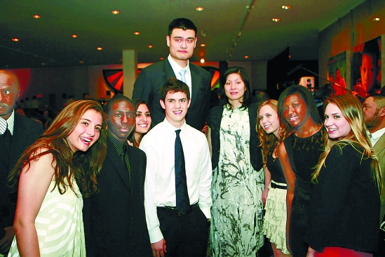 | 3月28日,姚明(中)和妻子叶莉与现场来宾合影。当日,姚明基金会、休斯敦美术馆、iTalkBB新电信公司联合举行盛大义卖、募捐、筹款晚宴。姚明在晚宴上宣布,由姚明基金会捐款在中国四川地震灾区兴建的三所希望小学已经竣工,另外三所希望小学今年夏天就可以建成,其中有一所在非震区。 新华社发 |