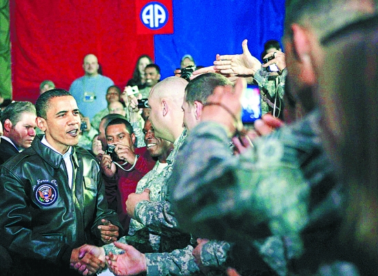 图为3月28日,美国总统奥巴马(前左)在阿富汗巴格拉姆空军基地与驻阿美军士兵握手。 新华社发