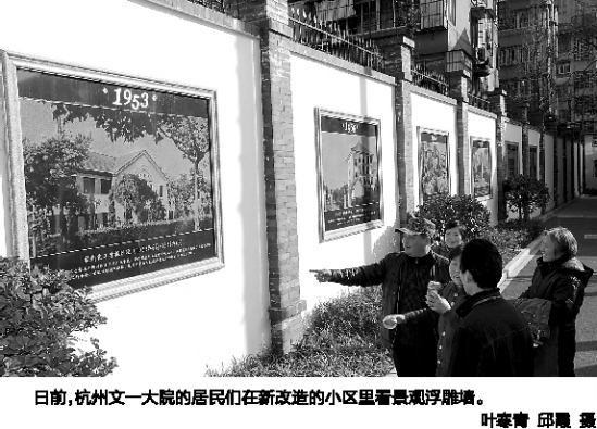 日前,杭州文一大院的居民们在新改造的小区里看景观浮雕墙。