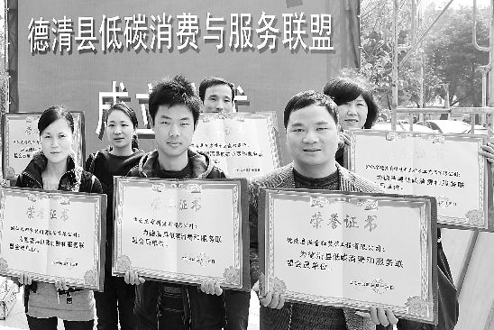 | 德清县新近成立低碳消费和服务联盟。该县24家企业作为首批联盟发起人, 在《低碳消费和服务联盟公约》上签字自律,倡导降低一次性用品的消费,积极宣传低碳消费理念,承诺多开发和销售低能耗、环保、节能的产品,带头践行低碳 。 叶寒青 李剑民 邵水明 摄 |