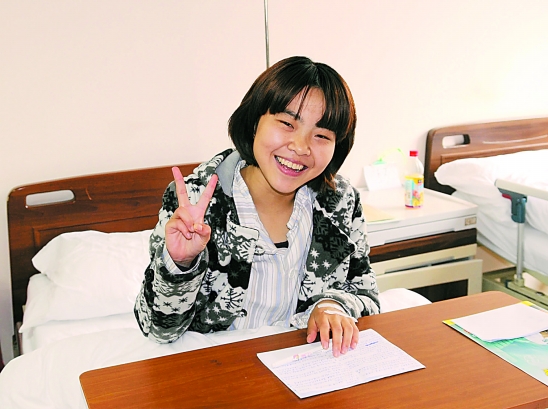 即使在病床上,包青春仍以快乐示人。程江峰 摄