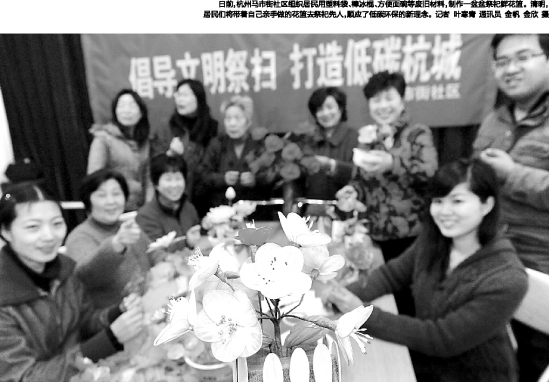 日前,杭州马市街社区组织居民用塑料袋、棒冰棍、方便面碗等废旧材料,制作一盆盆祭祀鲜花篮。清明,居民们将带着自己亲手做的花篮去祭祀先人,顺应了低碳环保的新理念。记者 叶寒青 通讯员 金帆 金欣 摄
