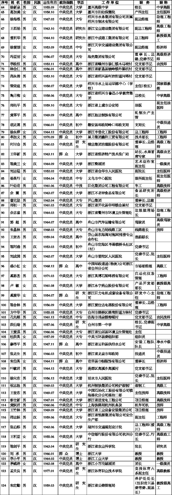 101 方中华 男 汉 1955.05 中共党员 大专 台州市路桥区路南街道方林村 党委书记