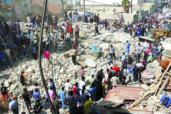 4月6日,在伊拉克首都巴格达,救援人员和当地居民聚集在爆炸现场。伊拉克警方6日说,首都巴格达当天发生多起爆炸,已造成34人死亡、100多人受伤。