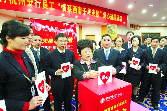 4月2日上午,中信银行杭州分行本部举行“情系西南干旱灾区”为主题的爱心捐款活动,行长王利亚带头捐款。据悉,中信杭州分行全辖仅用半天时间,就收到员工捐款共计32.9万元。 王哲 摄
