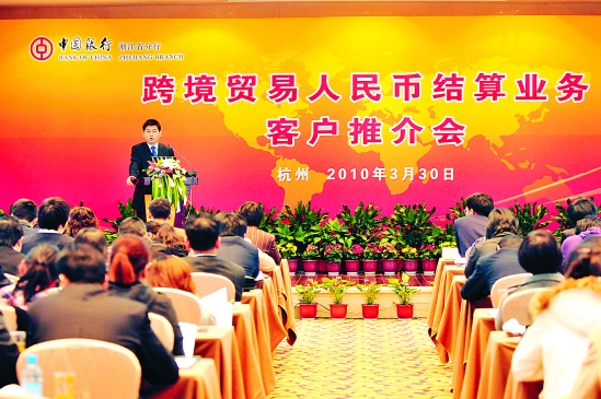| 3月30日下午,中行省分行在杭举办跨境贸易人民币结算业务客户推介会。中行总行专家介绍了跨境贸易人民币结算业务有关政策和产品,重点分析了跨境贸易人民币结算对外向型企业在规避汇率风险等方面的好处。据悉,目前中行省分行已整合各专业力量,为该业务在浙江的试点推出做好充分准备。 谢巍琦 摄 |