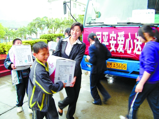 | 4月1日下午,平安寿险广西分公司员工将约19吨纯净水,送至此次西南旱情最严重地区之一的广西河池市,河池镇红七中学和红沙小学的1756名师生8个月来第一次喝上了纯净水。目前中国平安集团及旗下寿险、产险、银行等子公司确认捐赠的纯净水达300吨。中国平安还将帮助部分旱情严重地区开挖水窖。 施金 摄 |