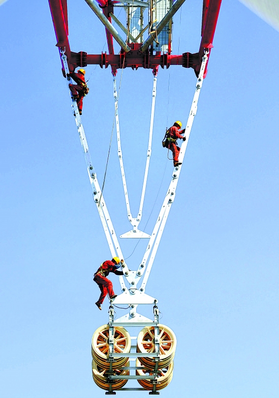 4月5日,全球最高的宁波凉帽山370米输电铁塔顺利结顶。图为施工人员正在370米高空为导线架设做准备。