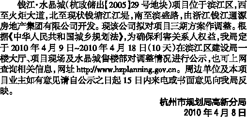 钱江·水晶城(杭政储出【2005】29号地块)项目位于滨江区,西至火炬大道,北至现状钱塘江江堤,南至滨盛路,由浙江钱江通源房地产集团有限公司开发。现该公司拟对项目三期方案作调整。根据《中华人民共和国城乡规划法》,为确保利害关系人权益,我局定于2010年4月9日~2010年4月18日(10天)在滨江区建设局一楼大厅、项目现场及水晶城售楼部对调整情况进行公示,也可上网查询相关信息,网址http://www.hzplanning.gov.cn。周边单位及本项目业主如有意见请自公示之日起15日内来电或书面意见向我局反映。
