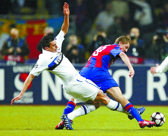 4月6日,国米球员卢西奥(左)在比赛中拼抢。当日,在欧洲足球冠军联赛1/4决赛次回合比赛中,意甲豪门国际米兰队客场以1比0击败莫斯科中央陆军队,从而以总比分2比0晋级四强。巴塞罗那队主场以4比1战胜阿森纳队,从而以总比分6比3晋级四强。 新华社发
