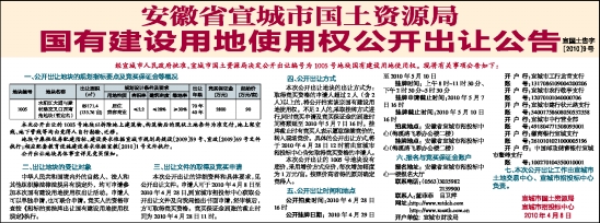 本次公开出让的详细资料和具体要求,见公开出让文件。申请人可于2010年4月8日至2010年4月28日,到宣城市招投标中心获取公开出让文件及向我局提出书面申请,经审核后,方可取得竞买资格。竞买保证金到账的截止时间为2010年4月28日11时。