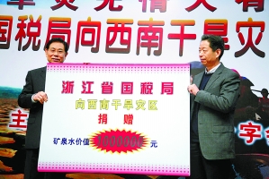 4月1日,省国税局通过省红十字会紧急向西南干旱灾区捐赠100万元,用于为西南干旱灾区希望中小学购买矿泉水。为此,省红十字会专门举行了捐赠仪式。省红十字会会长鲁松庭,省国税局党组书记、局长钱宝荣,部分红十字志愿者和新闻媒体参加了捐赠仪式。当日,3辆满载6000箱矿泉水的大卡车奔赴西南干旱重灾区,为那里的中小学生送去全省广大国税干部的一片爱心。
