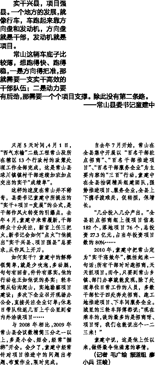 2010年,童建中把常山定为“实干高效年”,概括起来一句话:所有干部时时跑招商,天天抓项目。而今,只要到常山乡镇、部门办事就能发现,除了处理单位日常工作的人员,多数干部忙于四处奔走招商、跑工地推进项目、下车间服务企业。城里的三轮车师傅都说:“现在乘车的,谈的最多的是招商呀、项目呀,我们也能说出个一二三来!”
