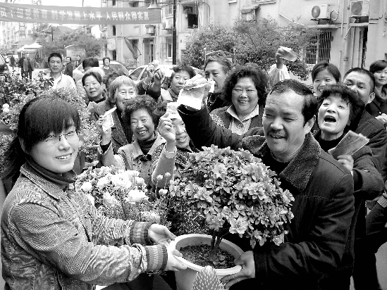 4月8日,杭州金钱巷社区举行“居民义卖家中盆景,千里支援云南抗旱”现场拍卖活动。 记者 邵全海 通讯员 朱慧琴 摄