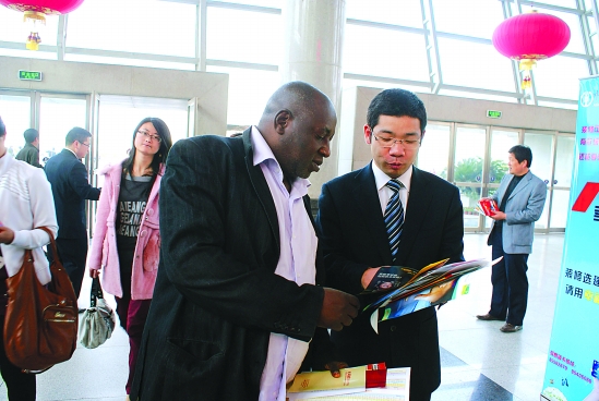 | 4月10日,人行义乌支行组织全市各金融机构在国际商贸城开展金融创新产品宣传活动,当天共发放宣传业务资料万余份。图为农行员工为外商解释西联汇款。 何恃坚 摄 |