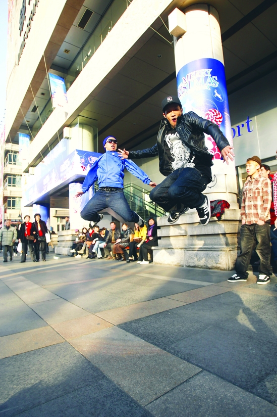 银泰门前跳街舞的年轻人。 本报记者 钟昊 摄