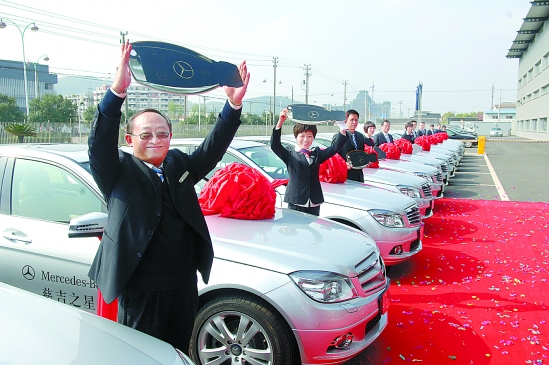 慈溪“慈吉之星”的20名员工,兴奋地开走了公司奖励的崭新奔驰轿车。浙江慈吉之星汽车有限公司是慈溪市第一家梅赛德斯—奔驰4S店,去年6月开业以来至今,在不到一年的时间里,进口和国产奔驰轿车销售达到400多辆,实现总销售额近4亿元。 记者 刘刚 通讯员 陈邦强 摄