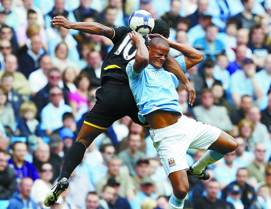 4月11日,曼城队球员科姆帕尼(右)与伯明翰队球员杰罗姆在比赛中争顶头球。新华社发