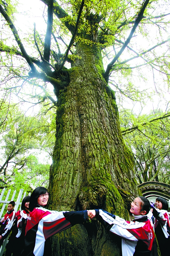4月12日,嘉兴秀洲区新塍镇中学的学生,来到镇小蓬莱公园参观千年古银杏树,听科学老师讲古树生态保护课。这棵古树高28.5米,树龄为1511年,被有关部门鉴定为我省最老的稀世古木。 记者 邵全海 通讯员 吴桂潮 摄
