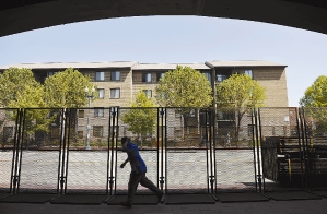 图为4月11日,在美国首都华盛顿会议中心,一名行人从被栅栏封起来的区域内走过。 新华社发 |