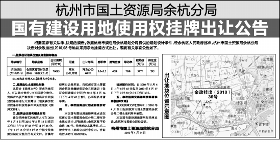根据国家有关法律、法规的规定,依据杭州市规划局余杭规划分局提供的规划设计条件,经余杭区人民政府批准,杭州市国土资源局余杭分局决定对余政挂出(2010)36号地块采用净地挂牌方式出让。现将有关事宜公告如下:
