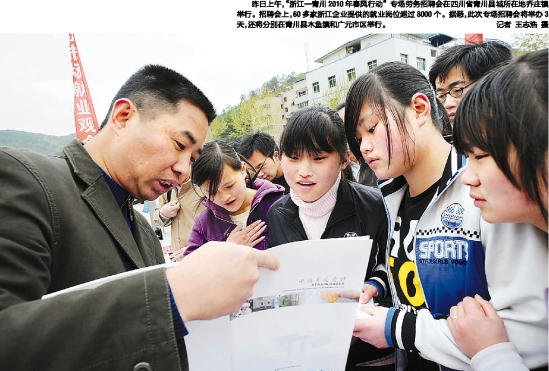 | 昨日上午,“浙江—青川2010年春风行动”专场劳务招聘会在四川省青川县城所在地乔庄镇举行。招聘会上,60多家浙江企业提供的就业岗位超过8000个。据悉,此次专场招聘会将举办3天,还将分别在青川县木鱼镇和广元市区举行。 记者 王志浩 摄 |