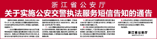 根据有关法律、法规规定,全省公安机关从2010年4月15日起,将实施公安交警执法服务短信告知,为本省注册登记的机动车所有人和驾驶人提供服务。现通告如下: