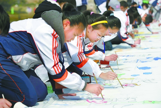 日前,二百多个来自杭州萧山区爱好美术的学生共同绘制了一幅百米长的世博多彩图。