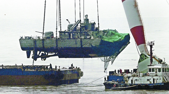 4月15日下午1时14分(北京时间12时14分),在韩国白翎岛海域,由韩国军方和民间组成的打捞工作组利用大型起重机将“天安”号警戒舰舰尾打捞出水后,成功放置在驳船上,接下来将正式开展失踪者搜寻工作。 新华社发