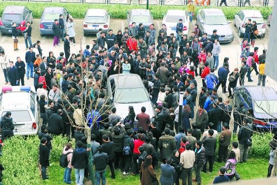 4月11日,中弘·北京像素开盘现场秩序混乱。该楼盘一夜涨价4000元,购房者不能接受,将开发商代表的车包围,纷纷讨说法。东方IC供图