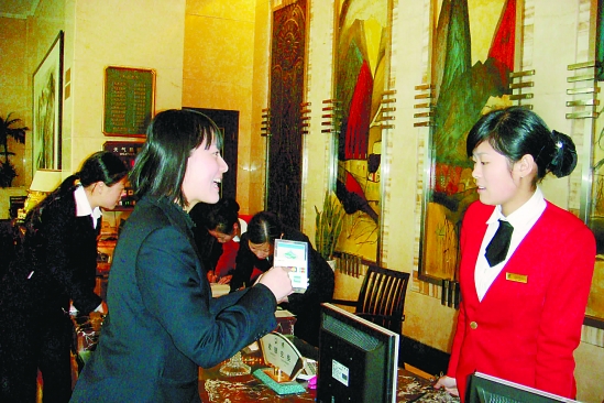 | 为了在世博会期间给游客提供便利的支付结算环境,建行乐清支行对重要商户进行检查,并张贴新的标识。图为4月16日,该行员工在雁荡山景区的酒店给收银员讲解受理外卡的有关常识。 虞乐云 摄 |