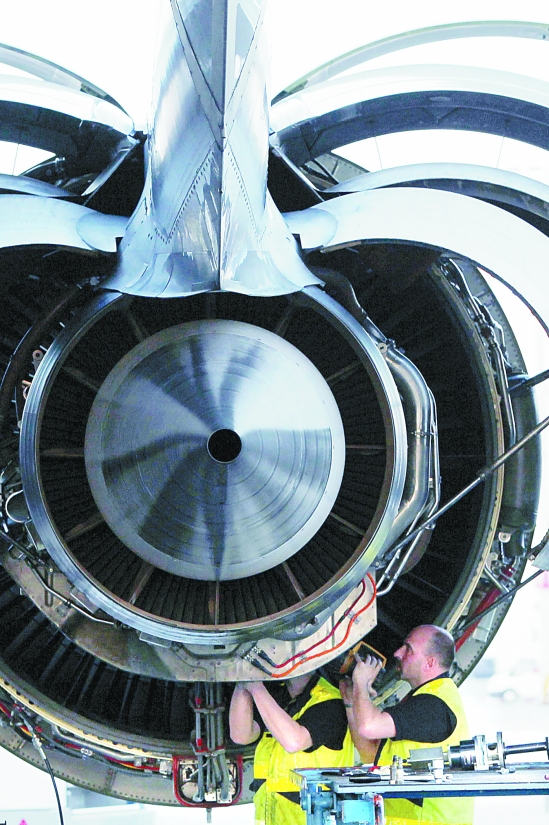 右图:在德国法兰克福国际机场,技术人员检修一架刚刚着陆的货运飞机。