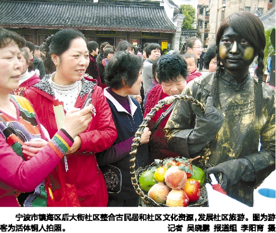 宁波市镇海区后大街社区整合古民居和社区文化资源,发展社区旅游。图为游客为活体铜人拍照。 记者 吴晓鹏 报道组 李阳育 摄