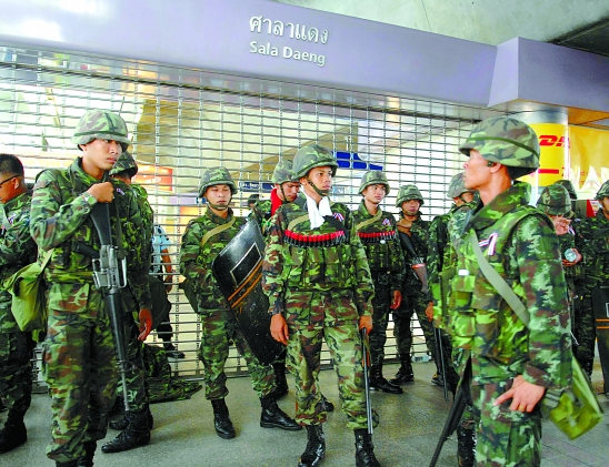 4月19日,在泰国首都曼谷是隆路,军人在轻轨车站执勤。新华社发
