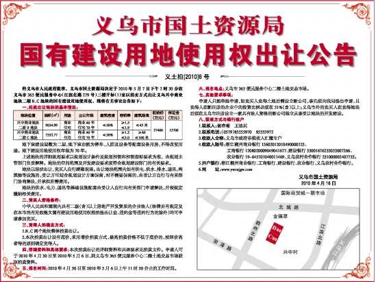 经义乌市人民政府批准,义乌市国土资源局决定于2010年5月7日下午2时30分在义乌市365便民服务中心(江滨北路279号)三楼开标(1)室以拍卖方式出让义乌兴中商业地块二期B、C地块的国有建设用地使用权。现将有关事宜公告如下: