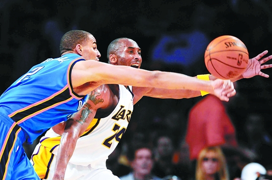 图为湖人队球员科比(右)在比赛中与对方球员争球。4月18日,NBA进行了季后赛的4场比赛,结果太阳队在主场被开拓者队以105比100征服,成为季后赛第一支主场输球的球队;湖人队、小牛队和魔术队则如愿取得了“开门红”。 新华社记者 戚恒 摄