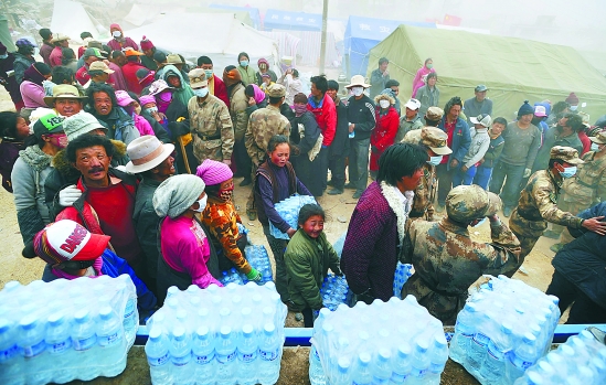 4月19日,受灾群众排队在结古镇一物资发放点领取生活物资。目前,大量救灾物资已经运往灾区,受灾群众的基本生活得到保障。 新华社记者 江宏景 摄