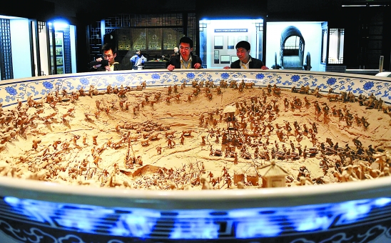 | 4月19日,国内首个蔬菜品种和种植技术博物馆在山东寿光落成。这座蔬菜专业博物馆总建筑面积达3000平方米,分为古代历史、蔬菜大观、科技创新、蔬菜与饮食等主要展区,系统展现了蔬菜栽培的历史进程。图为参观者在观看重现明清时期农业生产场景的泥塑作品。 新华社发 |