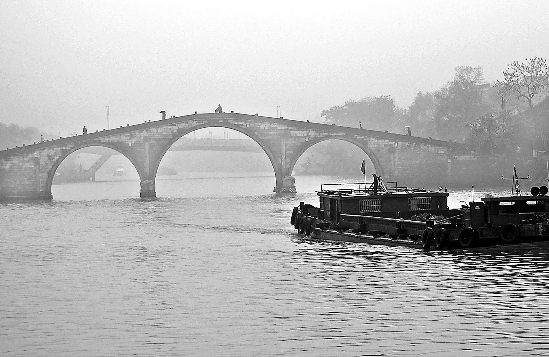 4月21日,一艘货船行驶在大雾弥漫的杭州京杭大运河上。当日,浙江省气象台发布大雾黄色预警信号:在浙江部分地区将持续出现能见度小于500米的浓雾天气。 新华社发