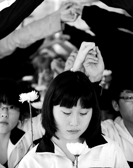 4月21日,中国美术学院的大学生们捧着小花,手拉着手,为在玉树地震中死难的同胞祈福。