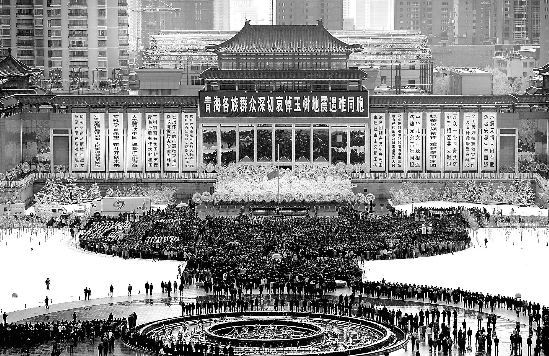 4月21日10时, 青海省在西宁新宁广场为玉树地震遇难者举行哀悼活动,上万群众为遇难同胞默哀3分钟。 本报记者 梁臻 摄