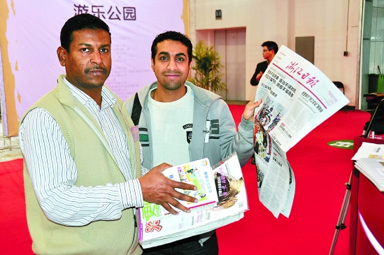 文博会上,来自也门的商人奥马尔兄弟正在阅读当天的《浙江日报》。徐畅 摄