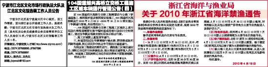 根据《中华人民共和国渔业法》、《浙江省渔业管理条例》和农业部渔业局有关规定与要求,现将2010年我省海洋捕捞禁渔规定通告如下: