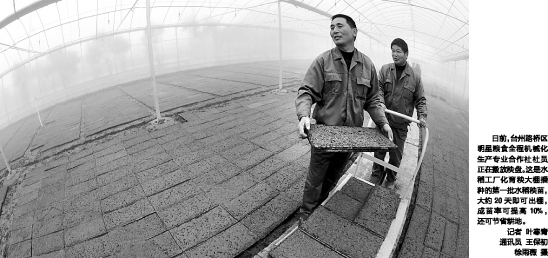 | 日前,台州路桥区明星粮食全程机械化生产专业合作社社员正在搬放秧盘。这是水稻工厂化育秧大棚播种的第一批水稻秧苗,大约20天即可出棚,成苗率可提高10%,还可节省耕地。 记者 叶寒青 通讯员 王保初 徐雨薇 摄 |
