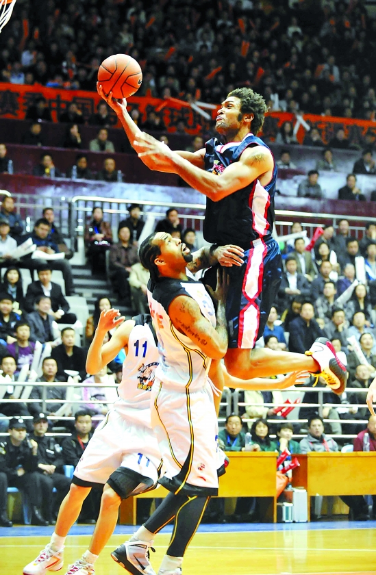图为广东东莞银行队球员哈里森(上)在比赛中飞身上篮。新华社发