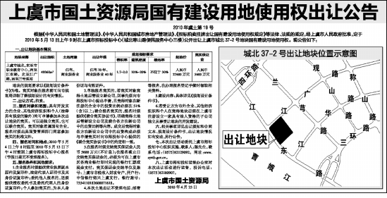 根据《中华人民共和国土地管理法》、《中华人民共和国城市房地产管理法》、《招标拍卖挂牌出让国有建设用地使用权规定》等法律、法规的规定,经上虞市人民政府批准,定于2010年5月13日上午9时在上虞市招标投标中心(城北称山路便民服务中心三楼)公开出让上虞市城北37-2号地块国有建设用地使用权。现公告如下: