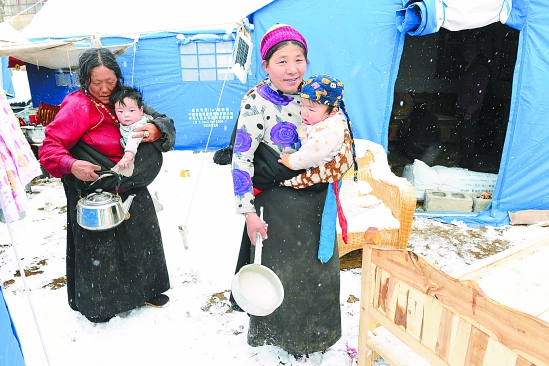4月22日清晨,玉树州出现降雪,结古镇结古村的百姓在雪中搬进新搭建的帐篷,打水烧火做早饭,开始一天的生活。 新华社发
