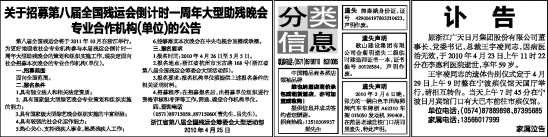 第八届全国残运会将于2011年10月在浙江举行。为更好地吸收社会专业机构参与本届残运会倒计时一周年大型助残晚会的策划和组织实施工作,现决定面向社会招募本次晚会的专业合作机构(单位)。